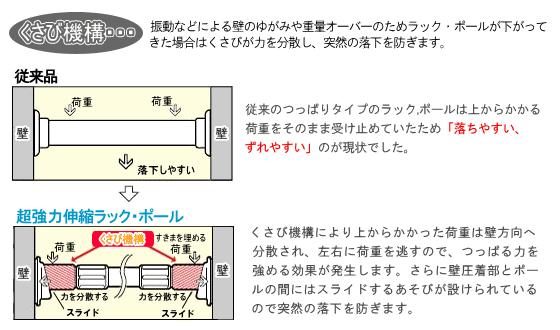 ●「くさび機構」振動などによる壁のゆがみや重量オーバーのためラック・ポールが下がってきた場合はくさびが力を分散し、突然の落下を防ぎます。